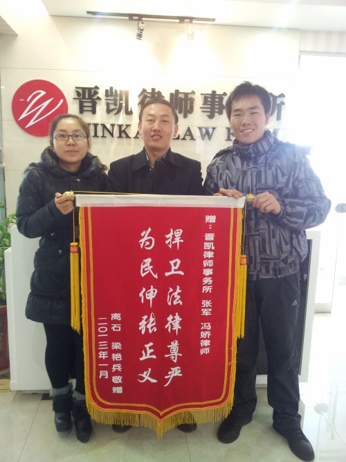 案件胜诉,当事人为我所张军、冯娇律师送锦旗致谢